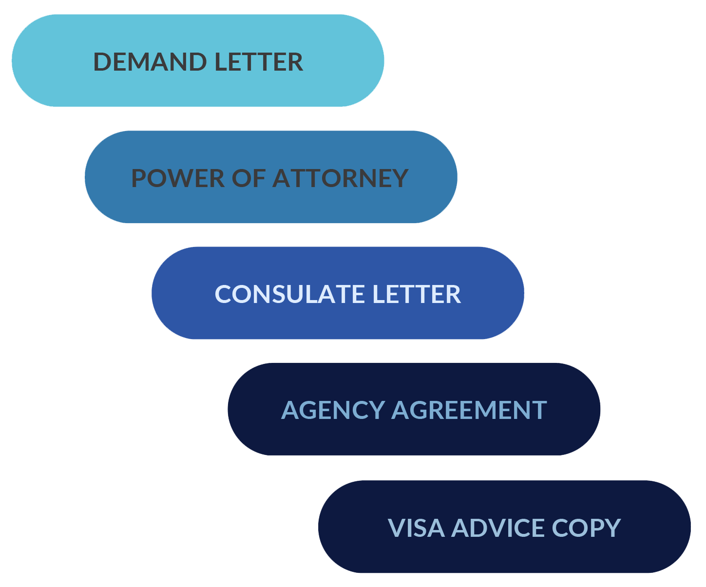 All these documents are to be dully attested, signed and sealed by the Foreign Ministry, Chamber of Commerce and Industry of the Employer's country and Bangladesh Embassy there.